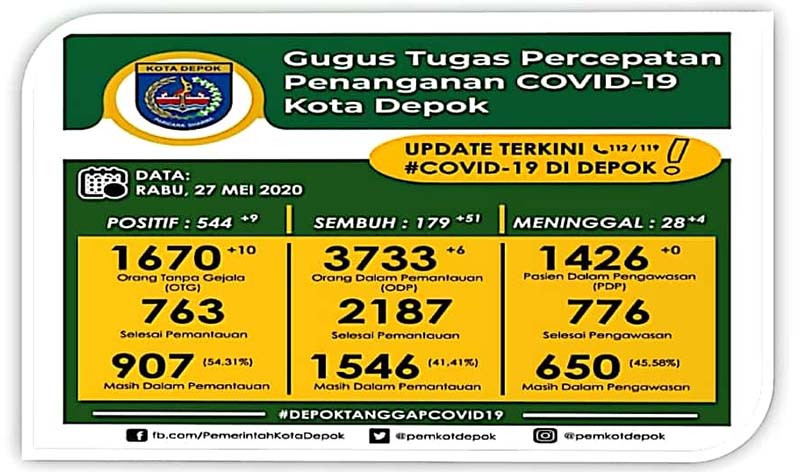 Secara rinci data kasus terkonfirmasi yang dihimpun Gugus Tugas Percepatan Penanganan Covid-19 Kota Depok diketahui angka positif sebanyak 544 (penambahan 9), sembuh 179 (penambahan 51), meninggal 28 (penambahan 4) OTG 1670 (penambahan 10), ODP 3733 (penambahan 6), dan PDP 1426 (penambahan 0).
