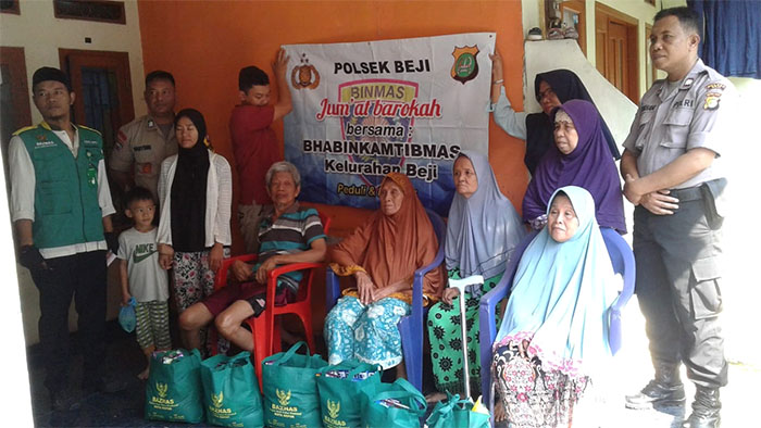 Harian Sederhana, Beji – Anggota Binmas Polsek Beji menggelar kegiatan sosial Jumat Berkah dengan membagikan sembako untuk kaum dhuafa dan orang tidak mampu .