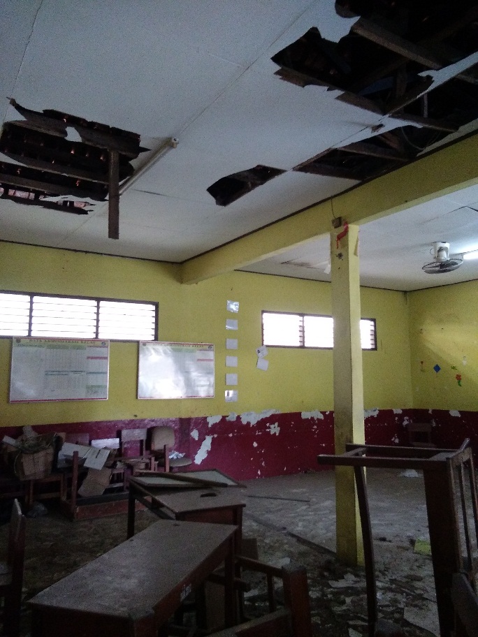Namun, karena kerusakan bangunan cukup parah, sehingga bagian atap bangunan ruang kelas tersebut patah, dampaknya merusak plafon yang ada didalamnya.