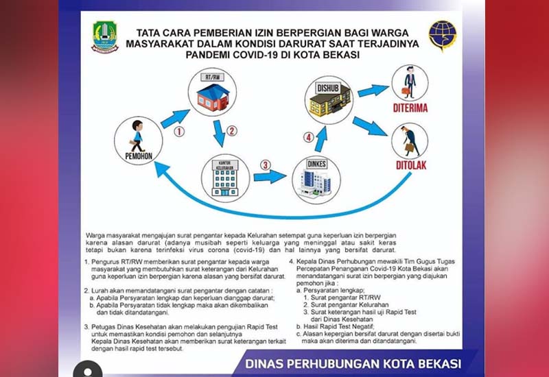 Harian Sederhana, Bekasi – Pemerintah Kota (Pemkot) Bekasi melalui Dinas Perhubungan mengeluarkan aturan tata cara pemberian izin berpergian bagi warga masyarakat dalam kondisi darurat saat terjadinya pandemi Covid-19.
