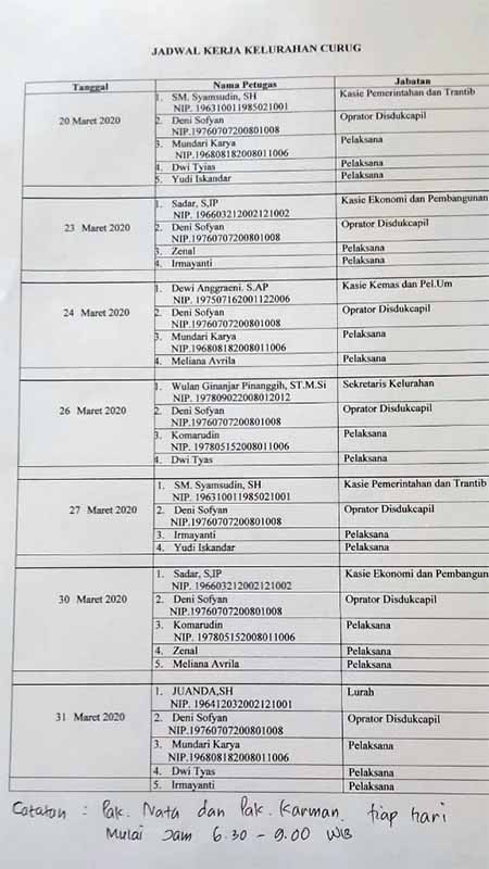 “Kehadiran kami sebagai sebagai pegawai di kelurahan diatur. Ini sesuai arahan pimpinan untuk pencegahan penyeberan Virus Corona,” ujar Komarudin staf ASN di Kelurahan Curug, Kamis (19/3).