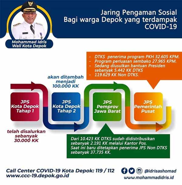 “Hingga saat ini Pemerintah Kota Depok telah menyalurkan JPS tahap pertama kepada 30.000 Kepala Keluarga (KK) Non DTKS. Namun pada penyaluran JPS tahap pertama tersebut masih ada kekurangan,” ungkap Walikota Depok,Mohammad Idris, di Balaikota Depok, Kamis (07/05/2020).