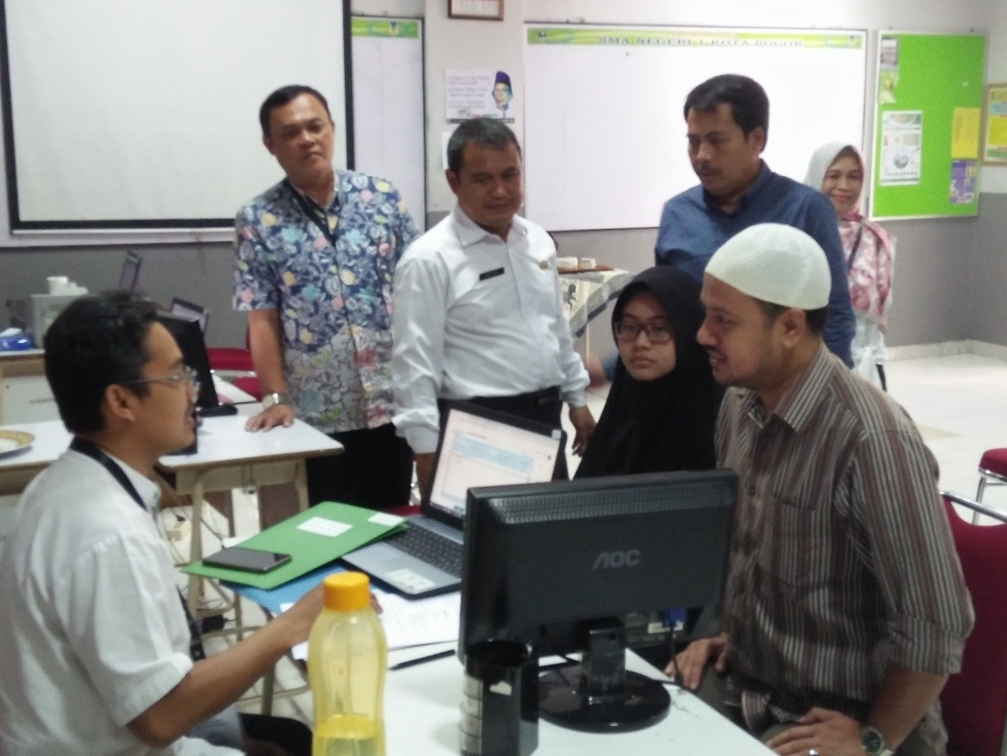 Kasi Pelayanan Cabang Dinas Pendidikan Wilayah 2 Jabar, Saptari  (dua kiri, berdiri), mendampingi  Kepala SMAN 1 Kota Bogor, Dr. R. Bambang Aryan saat ini PPDB online. (FOTO : BP.Sianturi/Harian Sederhana)