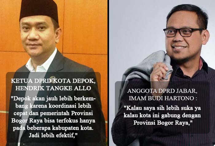 Anggota DPRD Provinsi Jawa Barat, Imam Budi Hartono mengaku dirinya lebih suka Kota Depok bergabung dengan Provinsi Bogor Raya. Hal ini lantaran pertimbangan pendekatan pelayanan, budaya, serta potensi Sumber Daya Alam (SDA) dan Sumber Daya Manusia (SDM).