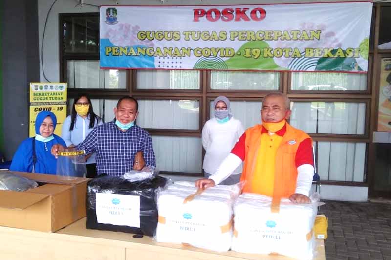 Arif Rahman Hakim (baju kotak biru), pasien pertama yang sembuh dari virus corona (Covid-19) memberikan sumbangan APD.
