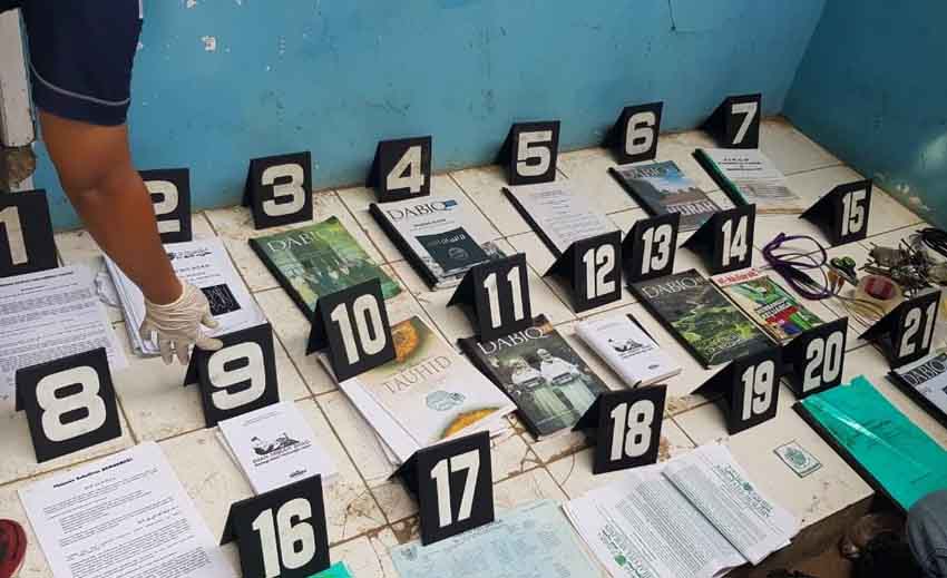 Sejumlah barang bukti di antaranya puluhan buku terkait jihad, khilafah, kabel, logo berlambang ISIS, dan paku.