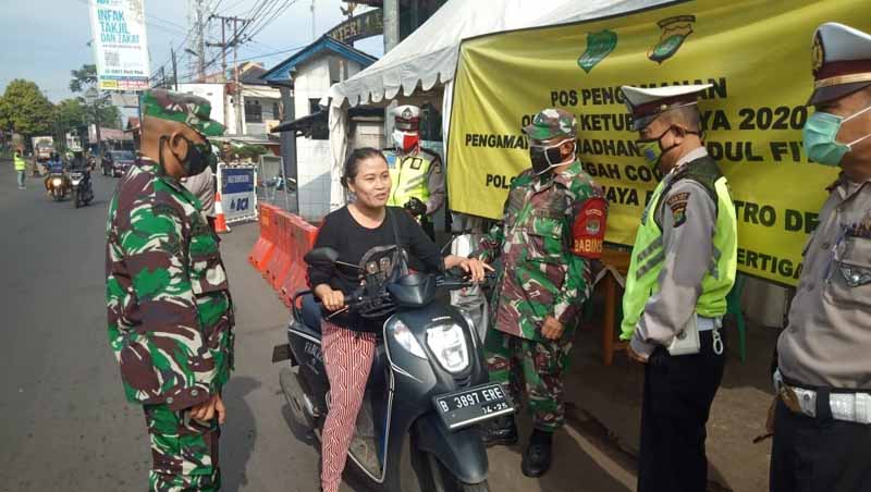 Salah satu titik pengawasan PSBB adalah check point Jalan Raya Bogor KM 38, Depok, Sabtu (23/05/2020). Anggota Koramil 03/Sukmajaya yang diterjunkan di lokasi tersebut adalah Serma Rudi bersama personil Kepolisian, Dishub, dan lainnya.