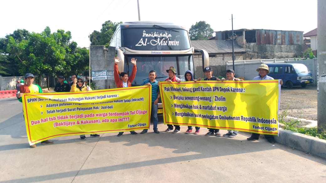 Aksi ini digelar agar Kementerian Agraria dan Tata Ruang mencabut atau membatalkan Surat Pemutusan Hubungan Hukum yang dikeluarkan oleh BPN Kota Depok.