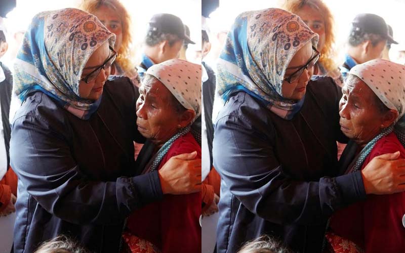 Sambil menangis, Iyah (68) memeluk Ade Yasin sambil menceritakan derita yang saat ini dialami olehnya. “Padi Wallahi ibu teu aya, rumah tos teu aya bu, menta tolong ibu ka ibu. (Rumah sudah tak ada, saya minta tolong ke ibu Bupati),” ceritanya.