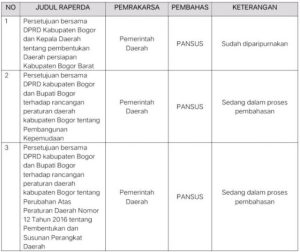 Fungsi pembentukan perda DPRD diwujudkan dalam membentuk peraturan daerah bersama dengan bupati, pada masa persidangan kedua tahun 2020, DPRD kabupaten Bogor dan Kepala Daerah Kabupaten Bogor telah menetapkan persetujuan bersama sebanyak 3 (tiga) yaitu tentang: