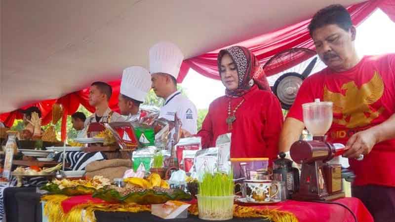 Wakil ketua HKTI Kabupaten Bogor Saptariani, saat menunjukkan produk kopi gunung salak cap Kujang, kepada Bupati Bogor Ade Yasin, diacara Food Festival Tradisional yang dilaksanakan di Lapangan Bumi Tegar Beriman, Minggu (17/11/2019). Foto : Andi Ahmad