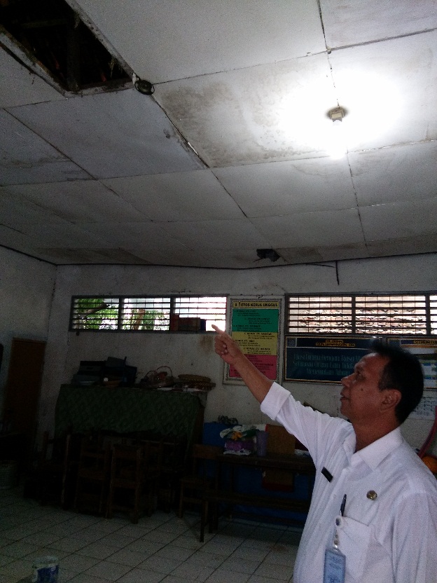 Bahkan plafon ukuran sekitar 6 x 7 meter persegi sudah turun, karena sebagian kayunya sudah tidak memiliki kekuatan lantaran pakunya sudah terlepas. Untuk menghindari hal-hal yang tidak diinginkan, ruang guru tersebut dikosongkan, sementara pindah ke ruangan tempat menyimpan alat-alat praktik dan alat musik angklung.