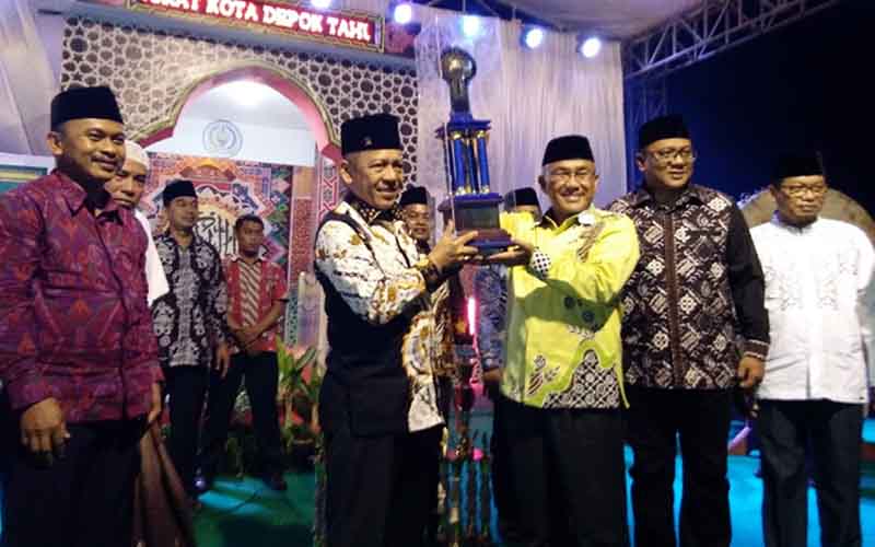 Wali Kota Depok, Mohammad Idris menyerahka piala bergilir kepala Camat Sawangan, Herry Restu Gumliar (dua kanan) setelah dinobatkan sebagai juara umum MTQ Ke-XX tahun 2019 di Lapangan Perumahan Sawagan Permai, Kelurahan Putih, Kecamatan Sawangan pada Jumat (1/11) sekitar 20.00 WIB.