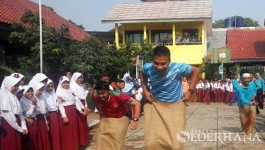Para guru menggunakan karung serius melompat hingga garis finish di ajang Lomba Tradisioanal. Kegiatan ini sebagai ajang silaturahmi.