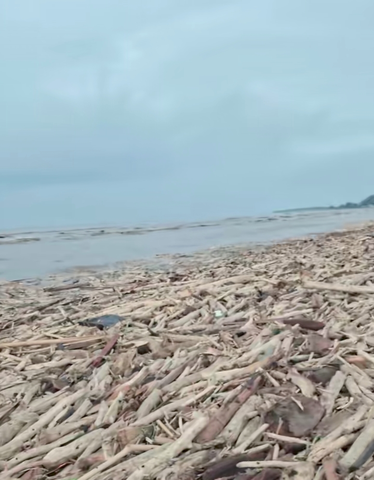 Salah satu unggahan viral warga di akun TikTok @hallopuspita, menunjukkan hamparan Pantai Larangan yang penuh dengan kayu.