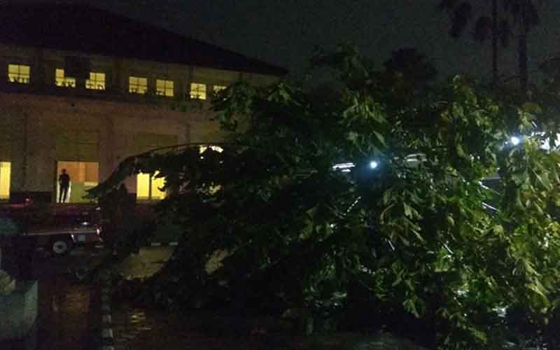 Harian Sederhana, Depok – Pohon mahoni yang tertanam di halaman parkir depan kantor DPRD Kota Depok tumbang saat hujan deras disertai angin kencang di wilayah Kelurahan Tirtajaya, Sukmajaya, Kota Depok pada Rabu (4/12/2018) sekira pukul 19.30 WIB.