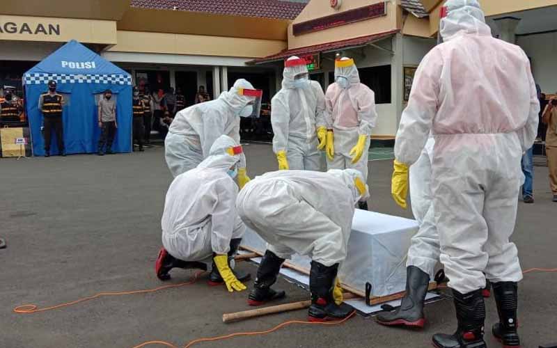 Hal itu diungkapkan Kapolres Sukabumi Kota AKBP Wisnu Prabowo, usai dilaksanakan simulasi penanganan Jenazah Covid-19 di halaman Mako Polres Kota Sukabumi, Senin (20/4)