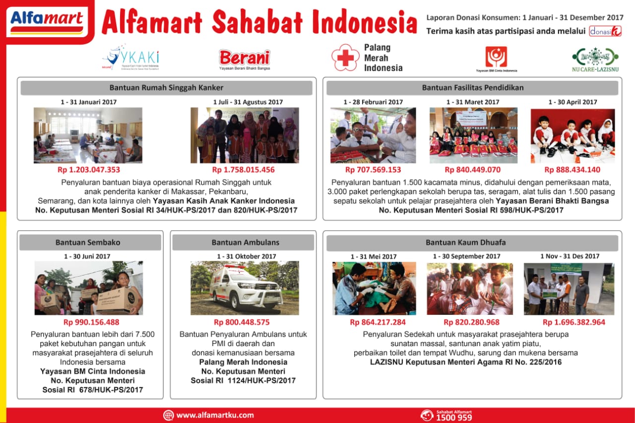 Sepanjang 2017, katanya lagi, Alfamart telah menyalurkan donasi konsumen senilai lebih dari Rp10 miliar melalui program-program sosial yang dikelola bersama 5 yayasan kredibel.