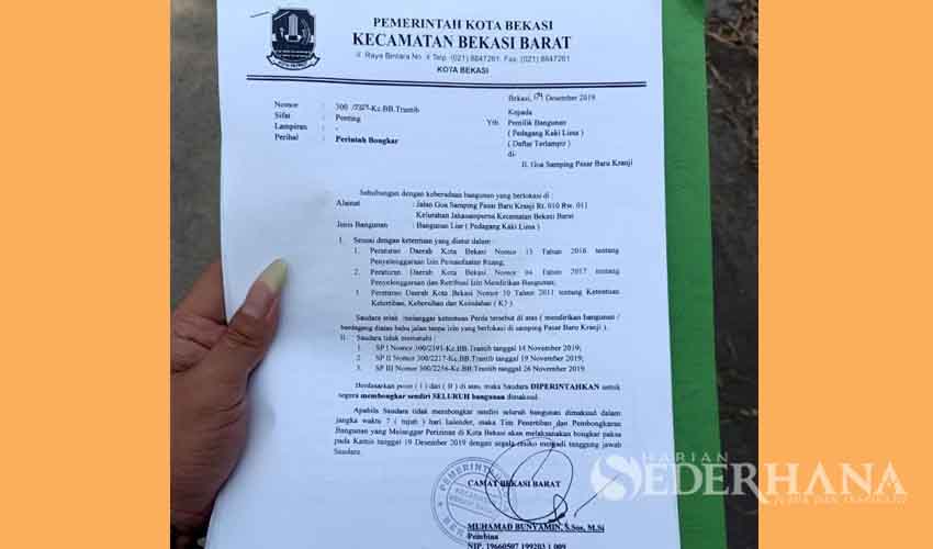 Peringatan yang ditanda tangani M Bunyamin selaku Camat Bekasi Barat itu, tertanggal 1 Nopember 2019.
