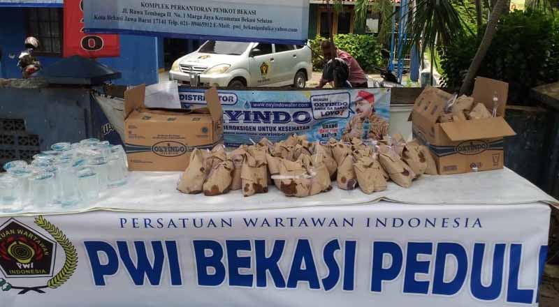 Berlokasi di halaman Kantor Sekretariat PWI Bekasi, Jalan Rawa Tembaga II, Kelurahan Margajaya, Kecamatan Bekasi Selatan, Kota Bekasi, ratusan nasi bungkus dan air mineral diberikan kepada masyarakat.