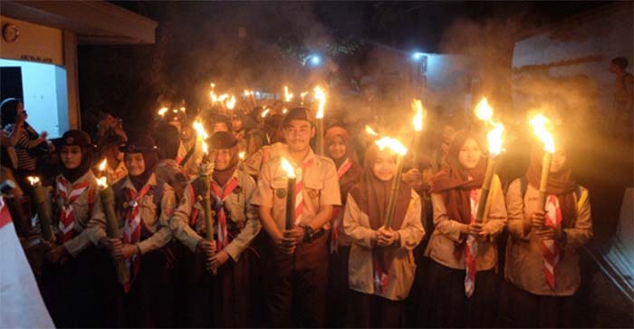 Ratusan Pramuka SMAN 7 Kota Bogor pawai obor dengan berjalan kaki dari Kecamatan Bogor Utara hingga Kecamatan Bogor Tengah.