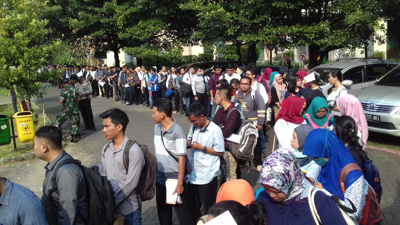 Metro Depok – Ribuan pencari kerja mendatangi pameran kesempatan kerja atau Job Fair Nasional XVII Tahun 2018 yang diselenggarakan oleh Kementerian Tenaga Kerja (Kemenaker) di Hotel Bumi Wiyata di Jalan Margonda, Kelurahan Kemirimuka, Kecamatan Beji, Rabu (04/07).