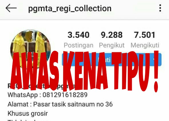 Harian Sederhana, Depok – Penyesalan hanya bisa dirasakan Prita Rizki Yulianti (39), warga perumahan Pondok Bambu Kuning Bojong Gede, Kabupaten Bogor. Pasalnya ia harus rela kehilangan uang sebesar Rp 3,4 juta setelah tertipu belanja di salah satu online shop melalui akun Instagram REGI_collection_pgmta.