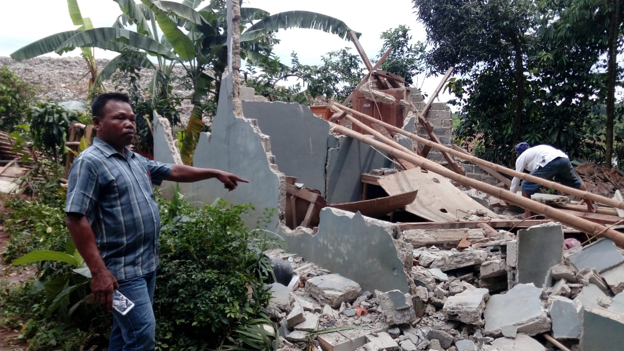 “Saya pikir ada gempa, engga tahunya bangunan bagian belakang rumah ambruk, setelah keluarganya keluar rumah, tiba-tiba bangunan bagian depan rumahnya juga ikut terdorong dan ambruk,” paparnya.