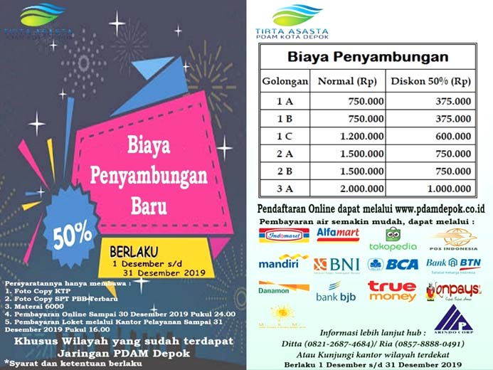 “Dengan program diskon 50% ini kami berharap warga Depok dapat memanfaatkan kesempatan untuk berlangganan PDAM dengan membayar Biaya Sambungan 1/2 nya dari harga normal. Untuk luas bangunan rumah di bawah 70 m2 dikenakan biaya penyambungan sebesar Rp.750.000 dari harga normal Rp.1.500.000,” ujarnya, kemarin.