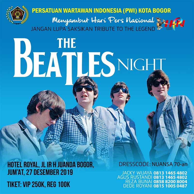 Pada 27 Desember 2019 malam nanti, animo terhadap buah karya lagu The Beatles itu, pasti akan menghentakkan audiens yang akan hadir di Royal Hotel, menghentakkan audiens yang akan hadir di Royal Hotel, jalan Ir. H. Juanda, Bogor Tengah.