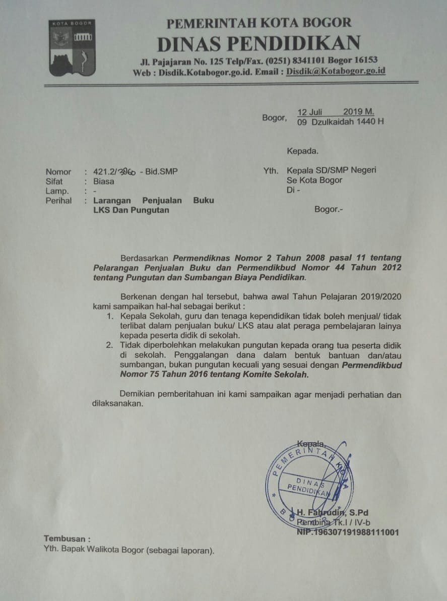 “Surat tersebut dibuat berdasarkan Permendikbud Nomor 2 Tahun 2008 Pasal 11 tentang pelarangan penjualan buku dan Permendikbud Nomor 44 Tahun 2012 tentang pungutan dan sumbangan biaya pendidikan,” tulis Kepala Dinas Pendidikan (Kadisdik) Kota Bogor, H. Fahrudin dalam suratnya bernomor 421.2/3860-bid SMP, tanggal 12 Juli 2019.