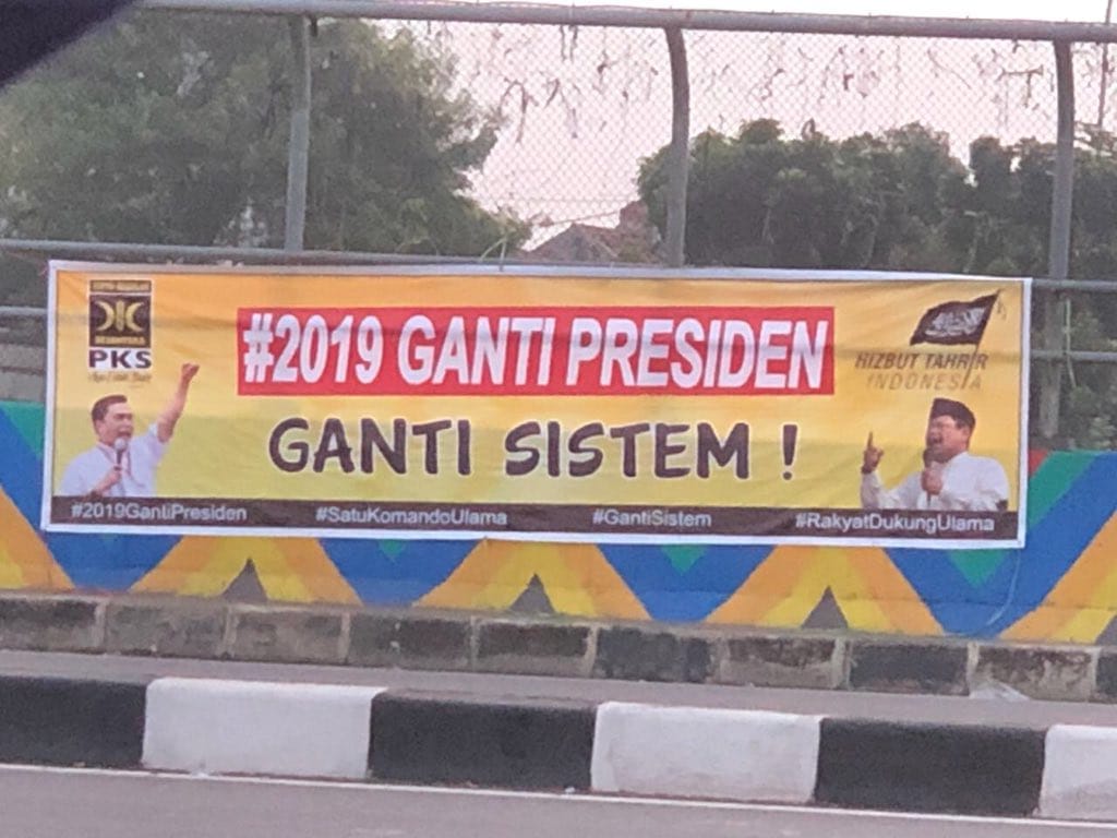“Spanduk itu kita temukan di Jalan Tole Iskandar dan pertigaan Masjid Al-Huda Sukmajaya. Dua sepanduk berlogo PKS berukuran 2×5 dgn tulisan _2019GantiPresiden Ganti Sistem Khilafah satu komando ulama,” katanya.