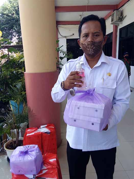 Camat Bojongsari, Dede Hidayat memperlihatkan bantuan nasi box, hand sanitizer dan masker dari K3S dan PGRI Bojongsari.