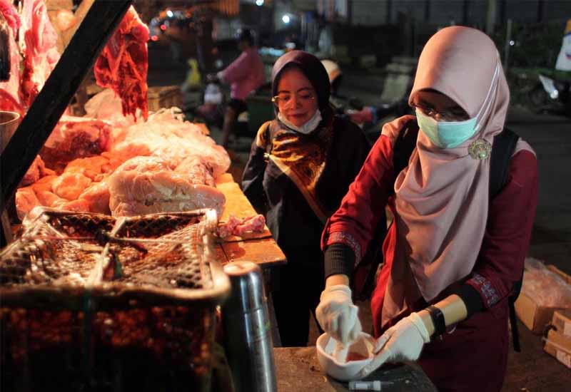 Tiba di pasar, petugas langsung mengecek daging yang dijajakan para penjual, termasuk surat dari rumah potong hewan. Sebagian lagi mengambil sampel daging untuk dilakukan rapid test atau uji cepat menggunakan alat khusus untuk mengetahui kandungan yang ada dalam daging tersebut.